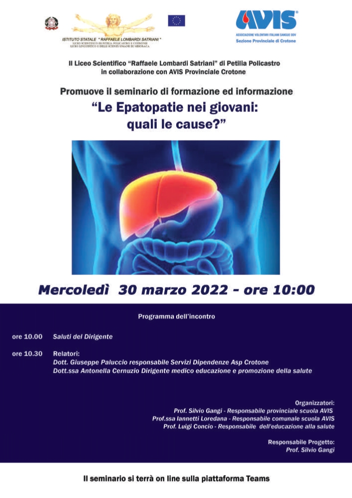 Il Liceo Scientifico "Raffaele Lombardo Satriani" di Petilia Policastro in collaborazione con l'Avis Provinciale di Crotone ha riorganizzato il seminario medico-scientifico sulle patologie del fegato che interessano principalmente i giovani, annullato il 23/02 scorso.