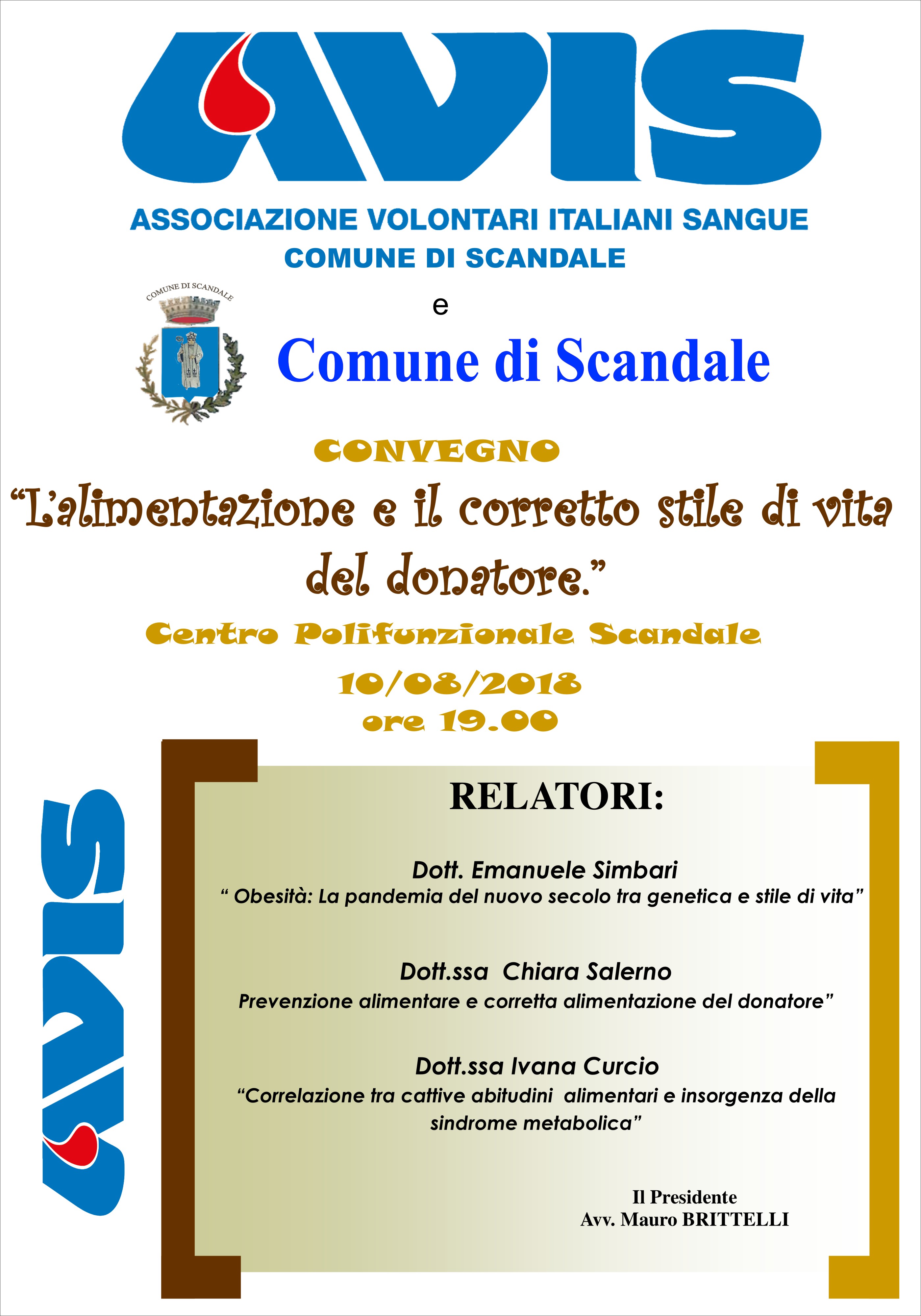 Si svolgerà a Scandale venerdì 10 agosto alle ore 19,00 presso il Centro Polifunzionale, il Convegno organizzato dalla locale Sezione Avis e il Comune di Scandale sul tema "L'alimentazione e il corretto stile di vita del Donatore". Relazioneranno i dott. Emanuele Simbari, Chiara Salerno e Ivana Curcio. Saranno presenti, oltre al Presidente Avis di Scandale Avv. Mauro Brittelli, il Sindaco prof. Antonio Barberio e il Presidente Avis Provinciale di Crotone Avv. Pietro Vitale.